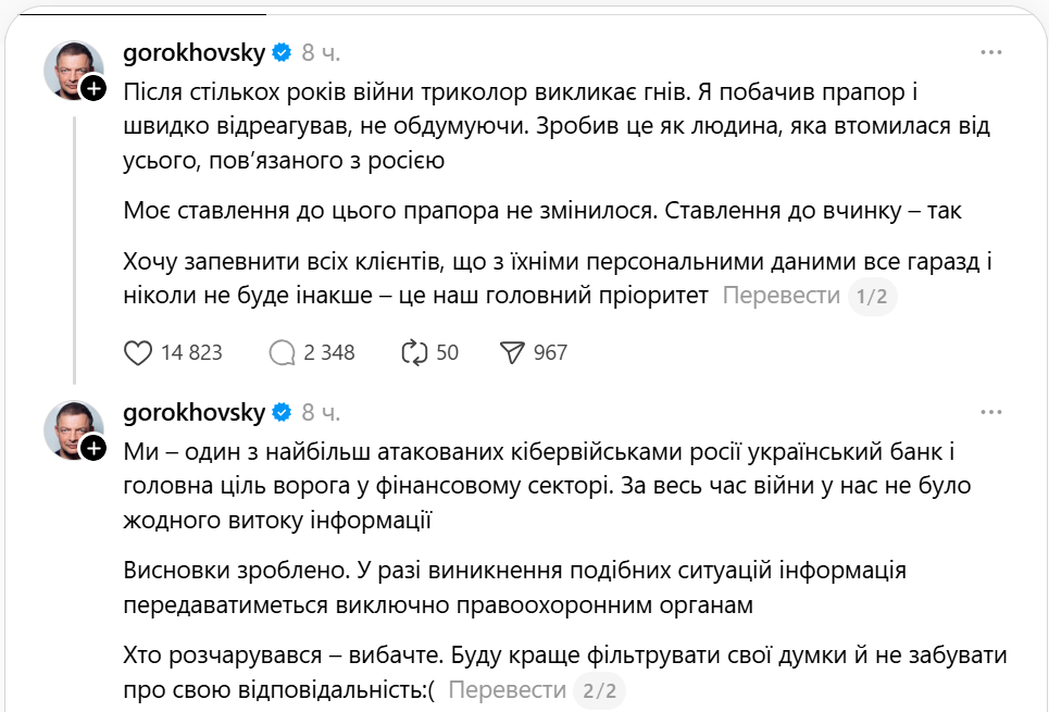 Після доказів того, що під час верифікації клієнтки банку, яку він зганьбив у мережі, в кадр попав прапор Словенії, а не РФ, а також після реакції Нацбанку співзасновник Monobank Олег Гороховський визнав помилку та вибачився. Пояснив свій вчинок втомою від війни.