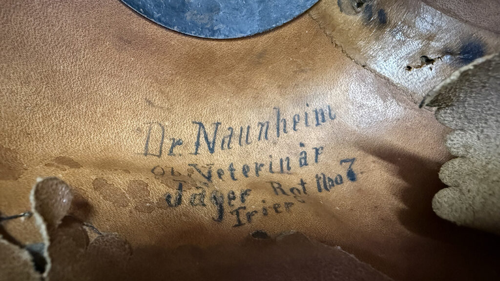 Всередині купол оздоблений шкірою типу лайка з полковим штампом. І штамп, і текст експерти визнали оригінальними. За їхніми висновками, шолом, ймовірно, належав лікарю-ветеринару єгерського полку Збройних сил Німецької імперії.