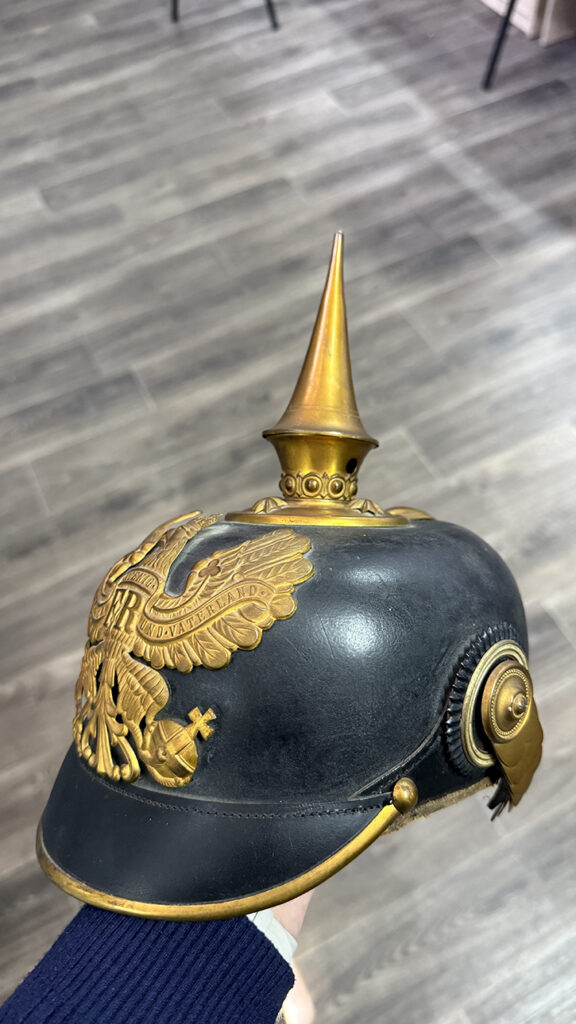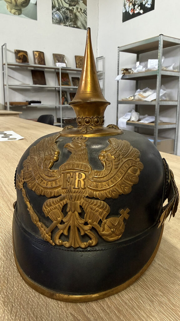 Експерти музею встановили, що це пікельгаубе (пікельгельм) — захисний шолом прусського офіцера 1915 року. Усі металеві елементи виготовлені зі сплаву на основі міді та позолочені, що характерно для офіцерського складу армії Німецької імперії.