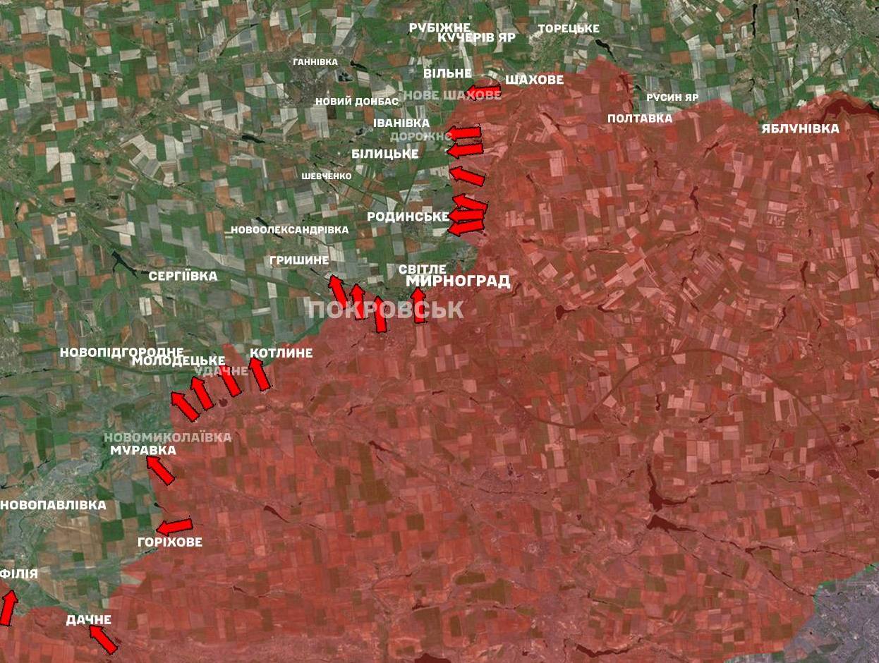 На Покровському напрямку наші захисники зупинили 72 штурмові дії агресора у районах населених пунктів Білицьке, Дорожнє, Нове Шахове, Родинське, Новоолександрівка, Мирноград, Шевченко, Гришине, Покровськ, Котлине, Удачне, Муравка, Новопідгородне, Молодецьке, Новопавлівка, Філія, Дачне.