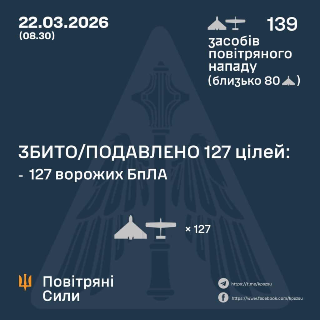 У ніч на 22 березня (з 18:00 21 березня) противник атакував 139 ударними БпЛА типу Shahed, Гербера, Італмас та безпілотниками інших типів із напрямків: Орел, Курськ, Брянськ, Міллерово, Шаталово, Приморсько-Ахтарськ – рф, Гвардійське – ТОТ АР Крим, біля 80 із них – “шахеди”.