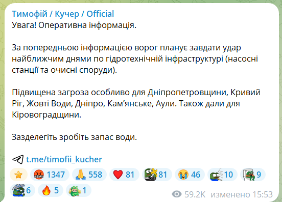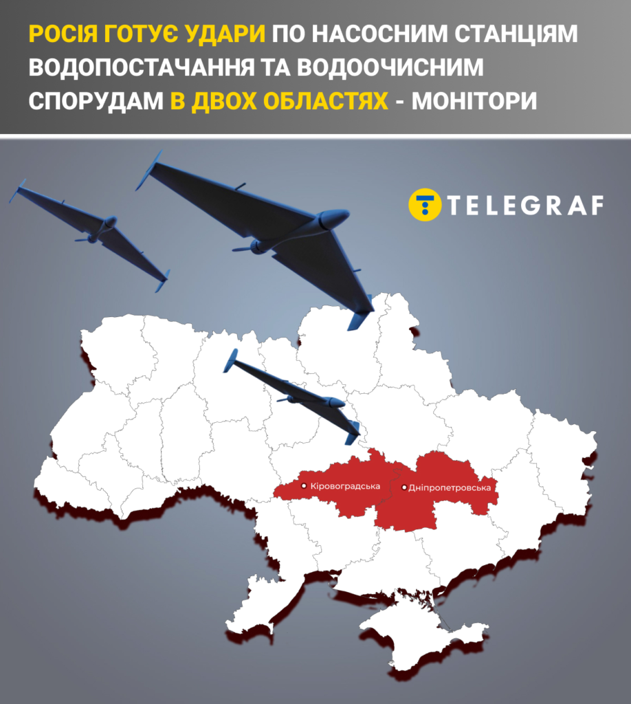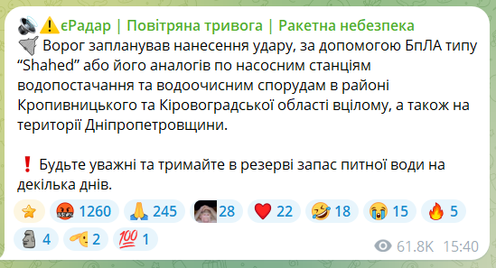 У мережі зʼявилися повідомлення про те, що ворог запланував завдання удару за допомогою БпЛА типу Shahed або його аналогів по насосних станціях водопостачання та водоочисним спорудам. Атака, по інформації пабликів, має відбутися в районі Кропивницького та Кіровоградської області в цілому, а також на території Дніпропетровщини.