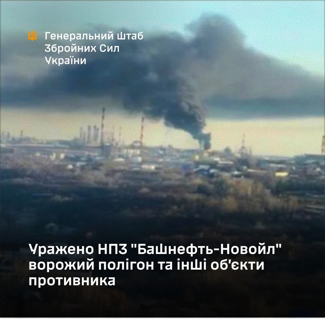 Зокрема, уражено нафтопереробний завод “Башнефть-Новойл” (Уфа, Башкортостан, рф). Зафіксовано ураження цілі з подальшою пожежею на території підприємства.