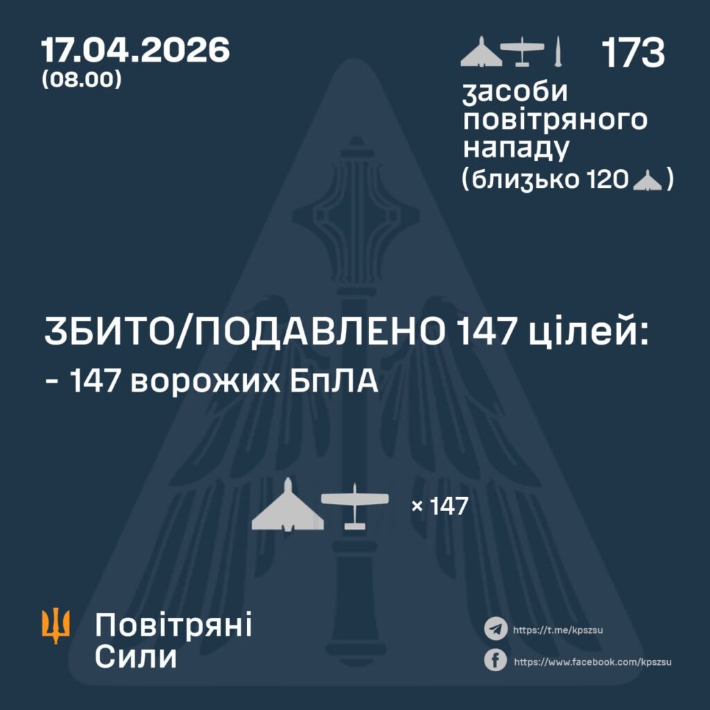 У ніч на 17 квітня (з 18:00 16 квітня) противник атакував однією балістичною ракетою Іскандер-М із ТОТ АР Крим, а також 172 ударними БпЛА типу Shahed, Гербера, Італмас та безпілотниками інших типів із напрямків: Брянськ, Курськ, Орел, Міллерово, Приморсько-Ахтарськ – рф., Гвардійське – ТОТ АР Крим, близько 120 із них – “шахеди”.