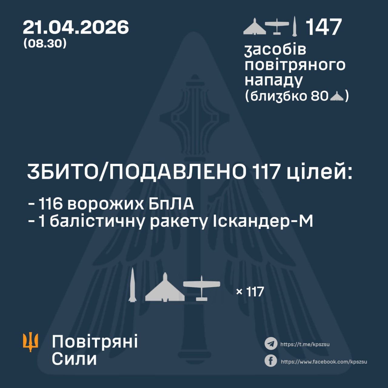 У ніч на 21 квітня (з 18:00 20 квітня) противник атакував двома балістичними ракетами Іскандер-М із Курської обл. – рф, та 143 ударними БпЛА типу Shahed, Гербера, Італмас та безпілотниками інших типів із напрямків: Курськ, Брянськ, Орел, Міллєрово, Приморсько-Ахтарськ – рф., Гвардійське, – ТОТ АР Крим, ТОТ Донецьк близько 80 із них – “шахеди”.