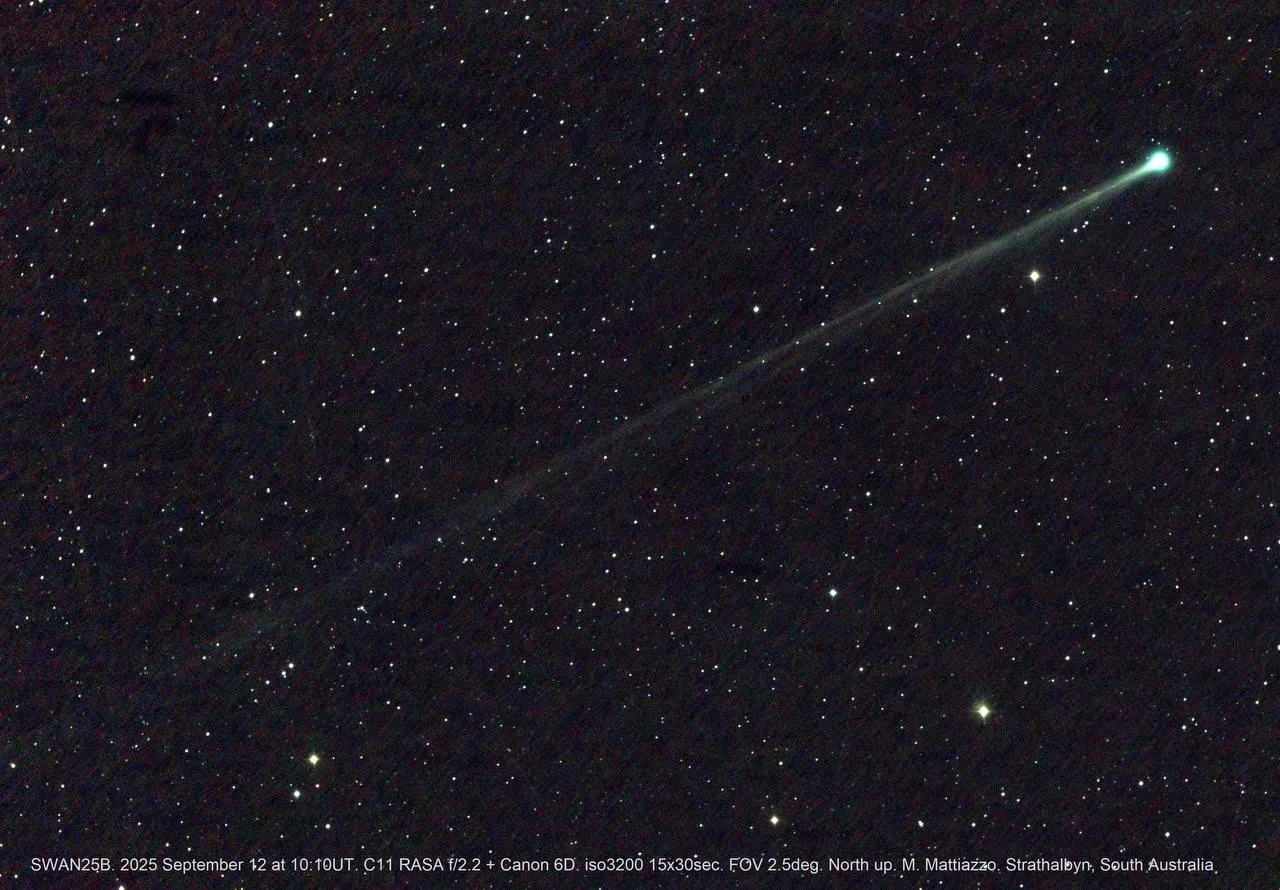 Знімок Машека показав, що комета має виразну газопилову хмару (кому) діаметром 3,7 кутової хвилини та іонний хвіст, що простягнувся на 2,8 градуса – це більше за п’ять діаметрів Місяця на небі. Наразі SWAN25B перебуває в сузір’ї Діви, поблизу зорі Спіка, і через близькість до Сонця її краще видно у Південній півкулі.