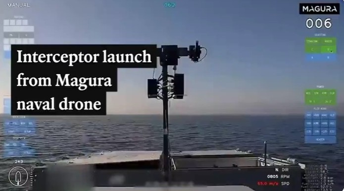 На кадрах видно, як на морському дроні відкривається контейнер, із якого вилітає невідомий перехоплювач. Він виявляє та уражає повітряну мішень, роль якої виконував безпілотник типу «крило».
